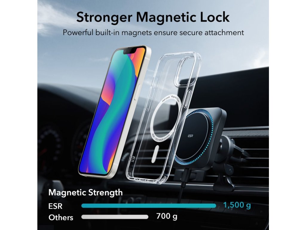 Objímka ESR je kompatibilní s bezdrátovým nabíjením MagSafe. Výrobek je vybaven magnety o hmotnosti 1200 g, takže si můžete užít pohodlné indukční nabíjení bez vyjímání pouzdra.