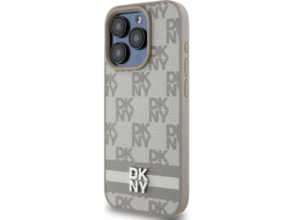 DKNY PU Leather Checkered Pattern and Stripe Zadní Kryt pro iPhone 14 Pro Max Beige