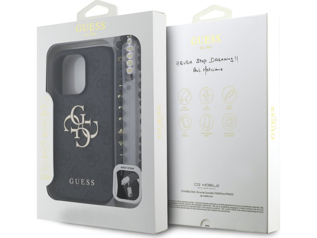 Prémiový zadní kryt Guess PU 4G Metal Logo Strap se vyznačuje elegantním, charakteristickým 4G vzorem, doplněným o logo GUESS. Kryt je vyrobený z lehkého a odolného polyuretanu (PU) s povrchovou úpravou z PU kůže a nabízí tak nejen skvělou ochranu telefonu, ale také pohodlí při používání. Tato povrchová úprava zajišťuje pevný úchop, což minimalizuje riziko, že telefon vyklouzne z ruky. Díky přesnému tvaru perfektně sedí na telefonu a umožňuje snadný přístup ke všem tlačítkům a konektorům. Tento prvotřídní kryt doplněný výrazným 4G logem a je skvělou nabídkou pro lidi, kteří si v módě cení nejen exkluzivního vzhledu, ale také vysoké kvality a funkčnosti. Kryt je doplněn elegantním korálovým poutkem, který můžete nasadit na zápěstí, aby vám telefon nevyklouzl z ruky. To vám zaručí bezpečné manipulování s Vaším zařízením. Je to nezbytný doplněk pro každého, kdo hledá kombinaci elegance a prestiže. Klíčové vlastnosti: - Originál Guess - Dominantní kovové logo 4G - Lehký a odolný kryt z PU a PU kůže - Skvěle se drží v ruce a neklouže - Přesně kopíruje tvar telefonu a umožňuje snadný přístup k tlačítkům a konektorům. - Chrání telefon před prachem a poškrábáním - Luxusní doplněk pro váš telefon i outfit - Doplněno stylovým korálovým poutkem