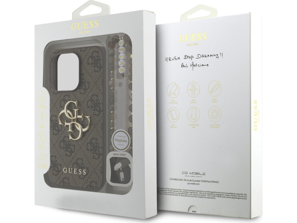 Prémiový zadní kryt Guess PU 4G Metal Logo Strap se vyznačuje elegantním, charakteristickým 4G vzorem, doplněným o logo GUESS. Kryt je vyrobený z lehkého a odolného polyuretanu (PU) s povrchovou úpravou z PU kůže a nabízí tak nejen skvělou ochranu telefonu, ale také pohodlí při používání. Tato povrchová úprava zajišťuje pevný úchop, což minimalizuje riziko, že telefon vyklouzne z ruky. Díky přesnému tvaru perfektně sedí na telefonu a umožňuje snadný přístup ke všem tlačítkům a konektorům. Tento prvotřídní kryt doplněný výrazným 4G logem a je skvělou nabídkou pro lidi, kteří si v módě cení nejen exkluzivního vzhledu, ale také vysoké kvality a funkčnosti. Kryt je doplněn elegantním korálovým poutkem, který můžete nasadit na zápěstí, aby vám telefon nevyklouzl z ruky. To vám zaručí bezpečné manipulování s Vaším zařízením. Je to nezbytný doplněk pro každého, kdo hledá kombinaci elegance a prestiže. Klíčové vlastnosti: - Originál Guess - Dominantní kovové logo 4G - Lehký a odolný kryt z PU a PU kůže - Skvěle se drží v ruce a neklouže - Přesně kopíruje tvar telefonu a umožňuje snadný přístup k tlačítkům a konektorům. - Chrání telefon před prachem a poškrábáním - Luxusní doplněk pro váš telefon i outfit - Doplněno stylovým korálovým poutkem