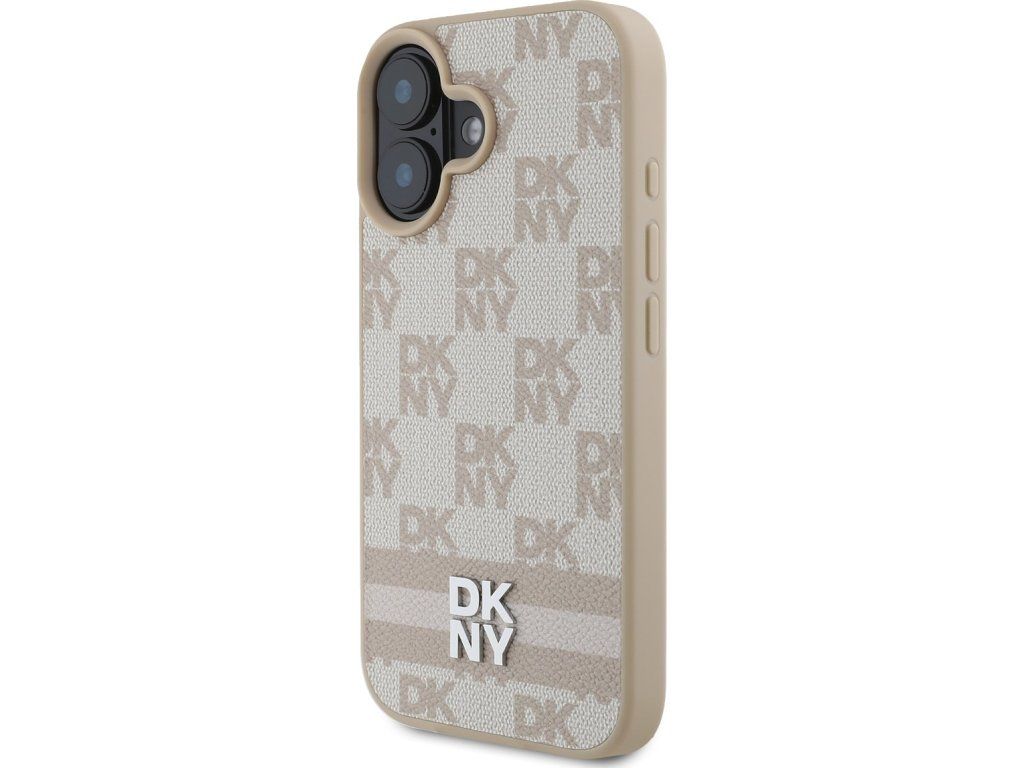DKNY PU Leather Checkered Pattern and Stripe Zadní Kryt pro iPhone 16 Pink