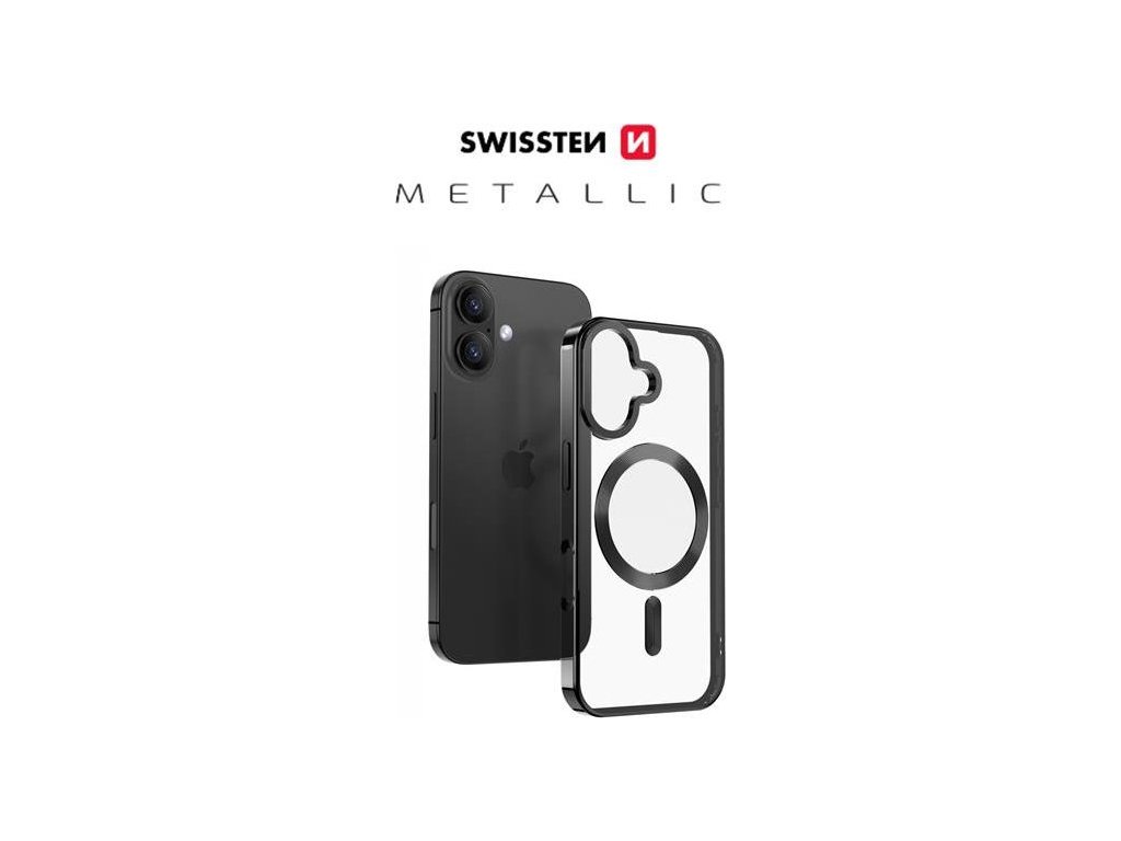 Luxusní čiré pouzdro SWISSTEN MagStick Metallic s elegantním černým rámečkem a metalickými doplňky. Vhodné pro dobíjení MagSafe. Baleno v blistru SWISSTEN