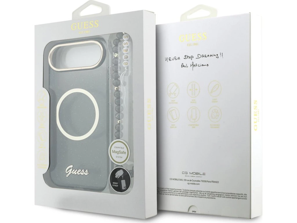 Guess IML Glitter Script Strap MagSafe zadní kryt na telefon je skvělým doplňkem pro všechny milovníky stylu a praktičnosti. Tento kryt je vyroben z kombinace pevného PC plastu na zadní straně a TPU měkkého plastu na bocích, což vytváří dokonalou symbiózu odolnosti a pohodlí. Díky přesnému tvaru perfektně sedí na telefonu a umožňuje snadný přístup ke všem tlačítkům a konektorům. Tento kryt podporuje technologii MagSafe, což znamená, že je kompatibilní s bezdrátovým nabíjením a dalšími MagSafe doplňky. Design krytu vyniká logem Guess na zadní straně a třpytivým lookem, což z něj činí nejen praktický, ale i stylový doplněk, který skvěle doplní váš outfit. Součástí krytu je i korálkové poutko, které plní nejen estetickou funkci, ale zajistí také bezpečné držení telefonu v ruce. Pokud hledáte kryt, který kombinuje eleganci a funkčnost, je tento kousek od GUESS tou pravou volbou pro vás. Klíčové vlastnosti: - Originál Guess - Poutko kolem zápěstí součástí krytu - Lehký a odolný kryt z prémiového PC a TPU - Skvěle se drží v ruce a neklouže - Podpora MagSafe - Přesně kopíruje tvar telefonu a umožňuje snadný přístup k tlačítkům a konektorům. - Chrání telefon před prachem a poškrábáním - Stylový a funkční doplněk pro váš telefon i outfit