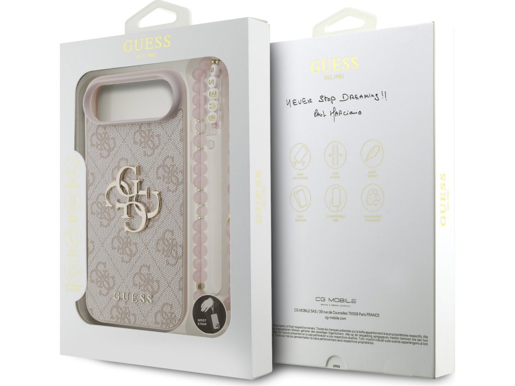 Prémiový zadní kryt Guess PU 4G Metal Logo Strap se vyznačuje elegantním, charakteristickým 4G vzorem, doplněným o logo GUESS. Kryt je vyrobený z lehkého a odolného polyuretanu (PU) s povrchovou úpravou z PU kůže a nabízí tak nejen skvělou ochranu telefonu, ale také pohodlí při používání. Tato povrchová úprava zajišťuje pevný úchop, což minimalizuje riziko, že telefon vyklouzne z ruky. Díky přesnému tvaru perfektně sedí na telefonu a umožňuje snadný přístup ke všem tlačítkům a konektorům. Tento prvotřídní kryt doplněný výrazným 4G logem a je skvělou nabídkou pro lidi, kteří si v módě cení nejen exkluzivního vzhledu, ale také vysoké kvality a funkčnosti. Kryt je doplněn elegantním korálovým poutkem, který můžete nasadit na zápěstí, aby vám telefon nevyklouzl z ruky. To vám zaručí bezpečné manipulování s Vaším zařízením. Je to nezbytný doplněk pro každého, kdo hledá kombinaci elegance a prestiže. Klíčové vlastnosti: - Originál Guess - Dominantní kovové logo 4G - Lehký a odolný kryt z PU a PU kůže - Skvěle se drží v ruce a neklouže - Přesně kopíruje tvar telefonu a umožňuje snadný přístup k tlačítkům a konektorům. - Chrání telefon před prachem a poškrábáním - Luxusní doplněk pro váš telefon i outfit - Doplněno stylovým korálovým poutkem