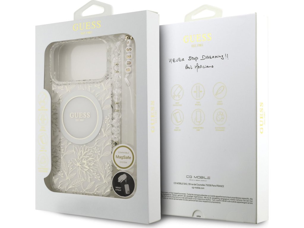 Guess IML Allover Pearl Strap MagSafe zadní kryt na telefon je skvělým doplňkem pro všechny milovníky stylu a praktičnosti. Tento kryt je vyroben z kombinace pevného PC plastu na zadní straně a TPU měkkého plastu na bocích, což vytváří dokonalou symbiózu odolnosti a pohodlí. Díky přesnému tvaru perfektně sedí na telefonu a umožňuje snadný přístup ke všem tlačítkům a konektorům. Tento kryt podporuje technologii MagSafe, což znamená, že je kompatibilní s bezdrátovým nabíjením a dalšími MagSafe doplňky. Design krytu vyniká logem Guess v kruhu, což z něj činí nejen praktický, ale i stylový doplněk, který skvěle doplní váš outfit. Součástí krytu je i korálkové poutko, které plní nejen estetickou funkci, ale zajistí také bezpečné držení telefonu v ruce. Pokud hledáte kryt, který kombinuje eleganci a funkčnost, je tento kousek od GUESS tou pravou volbou pro vás. Klíčové vlastnosti: - Originál Guess - Poutko kolem zápěstí součástí krytu - Lehký a odolný kryt z prémiového PC a TPU - Skvěle se drží v ruce a neklouže - Podpora MagSafe - Přesně kopíruje tvar telefonu a umožňuje snadný přístup k tlačítkům a konektorům. - Chrání telefon před prachem a poškrábáním - Stylový a funkční doplněk pro váš telefon i outfit
