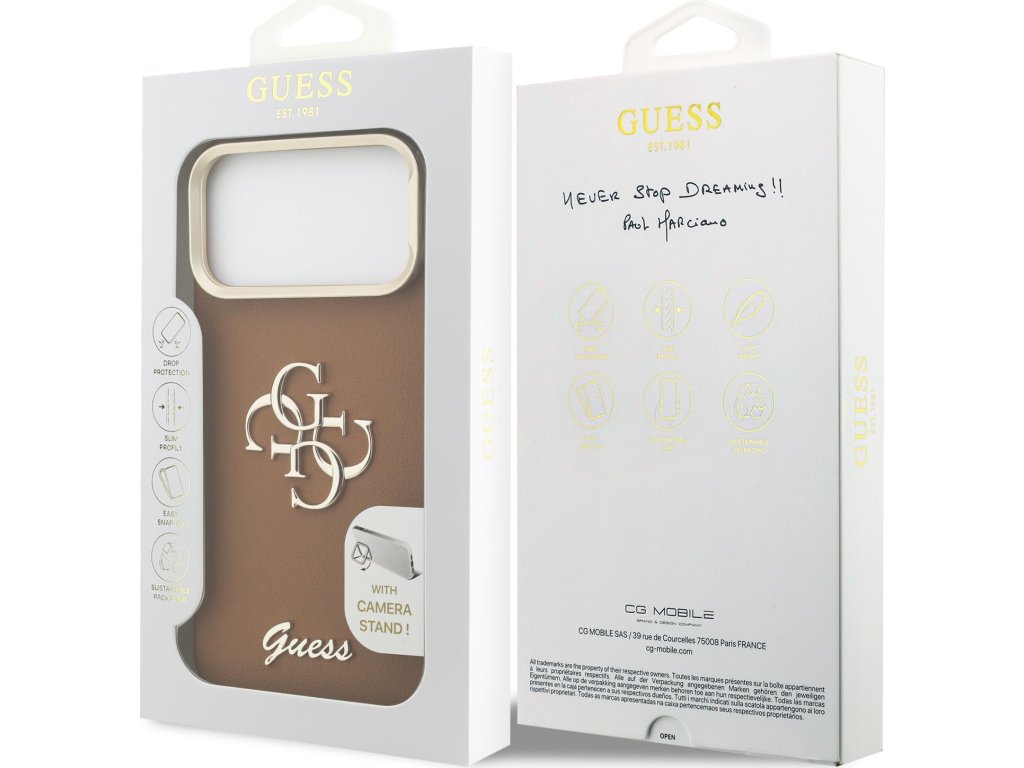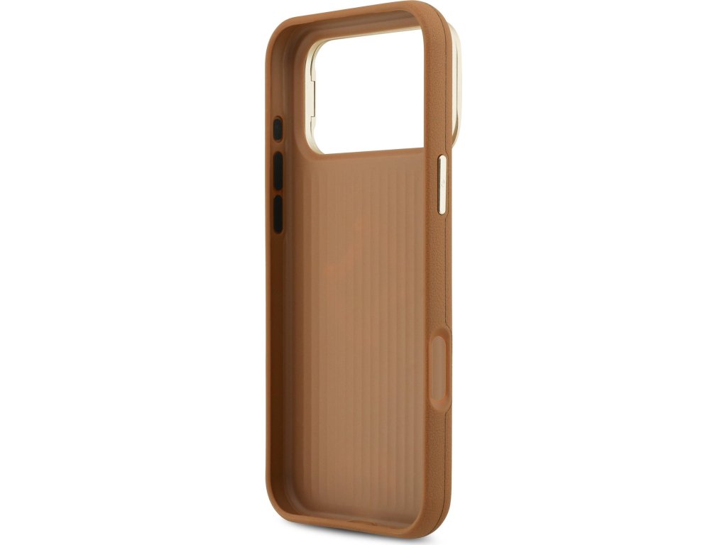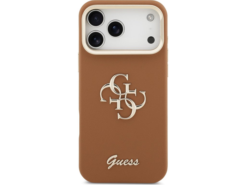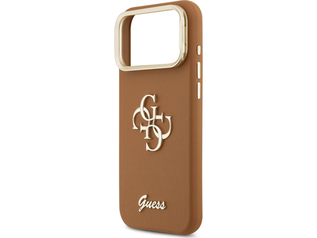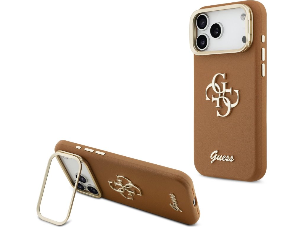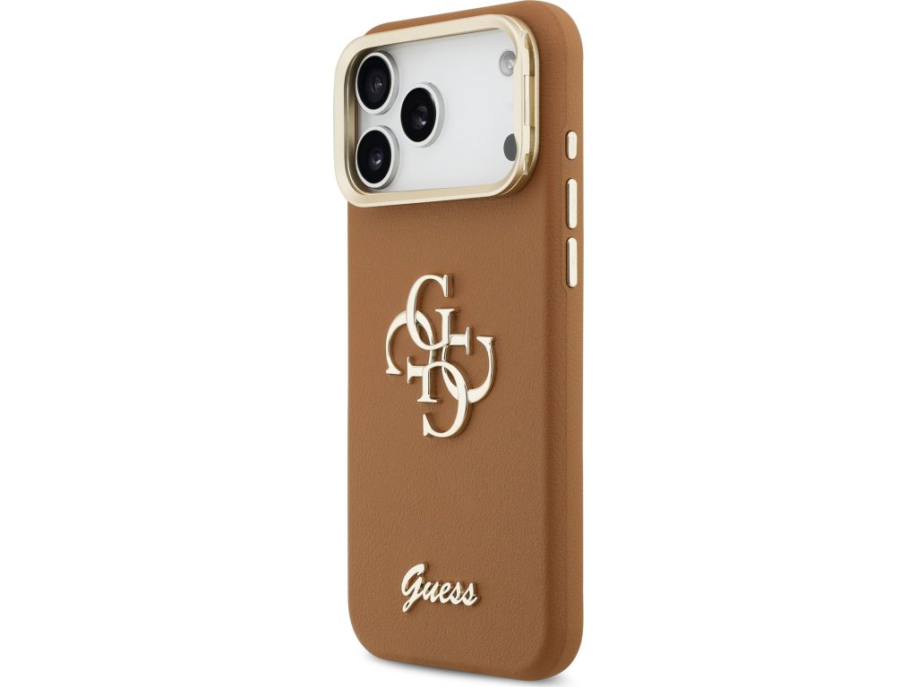 Guess PU Grained 4G Logo Stand Camera Frame Zadní Kryt pro iPhone 17 Pro Max Brown