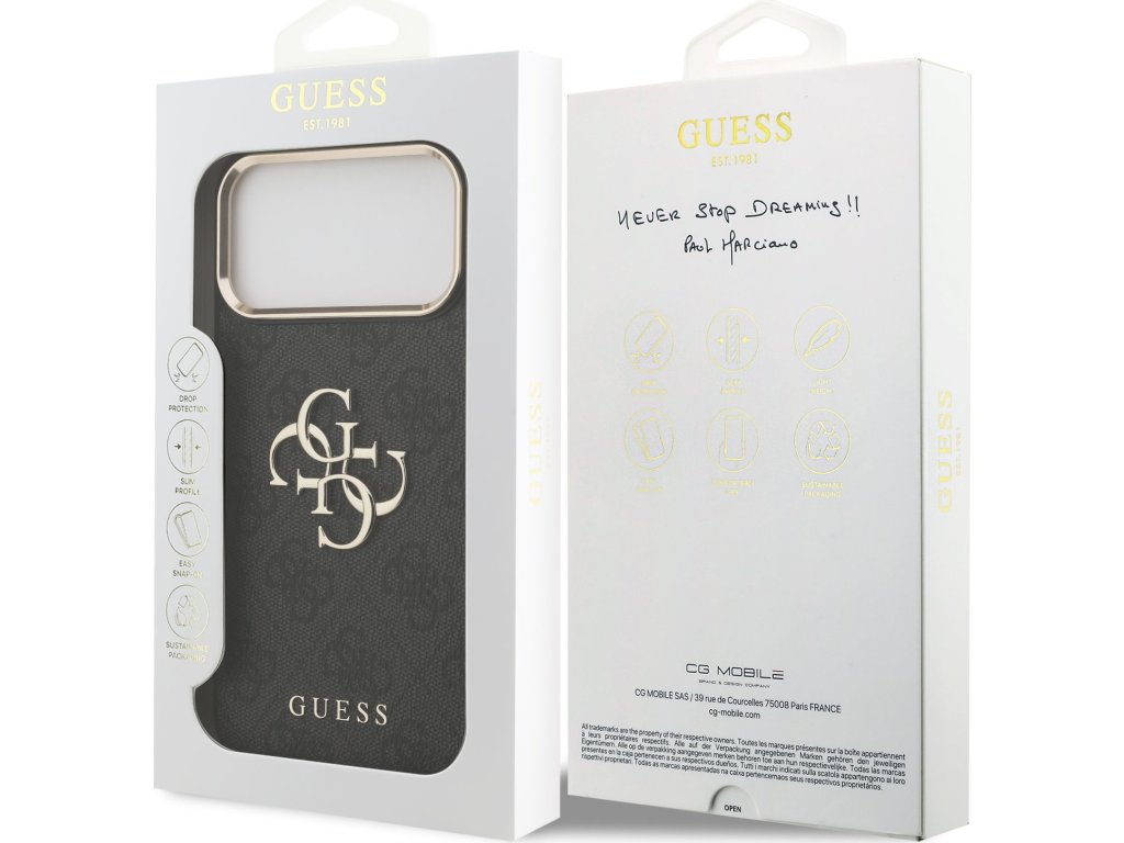 The case is crafted from high-quality, textured eco-leather , complemented by the large, iconic 4G symbol and the metal Guess logo . Additionally, the case features an elegant, subtle 4G monogram pattern that repeats throughout, giving it a unique and recognizable character.