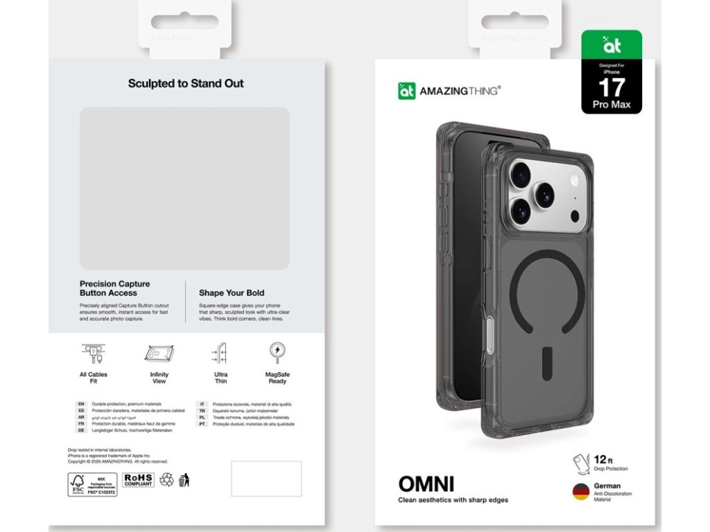 The AmazingThing Omni case combines elegance and durability, designed specifically for the iPhone 17 Pro Max. The slim, ultra-thin design highlights the phone's modern look, while square edges and sharp lines add a distinctive character. High-quality material ensures resistance to everyday use and a long-lasting aesthetic. The case effectively protects the device from drops from up to 3.6 meters, and precisely crafted cutouts ensure easy access to all buttons and ports. The Omni model is fully compatible with MagSafe technology, allowing you to use magnetic chargers and accessories without having to remove the case. The classic black finish adds elegance and suits any occasion.