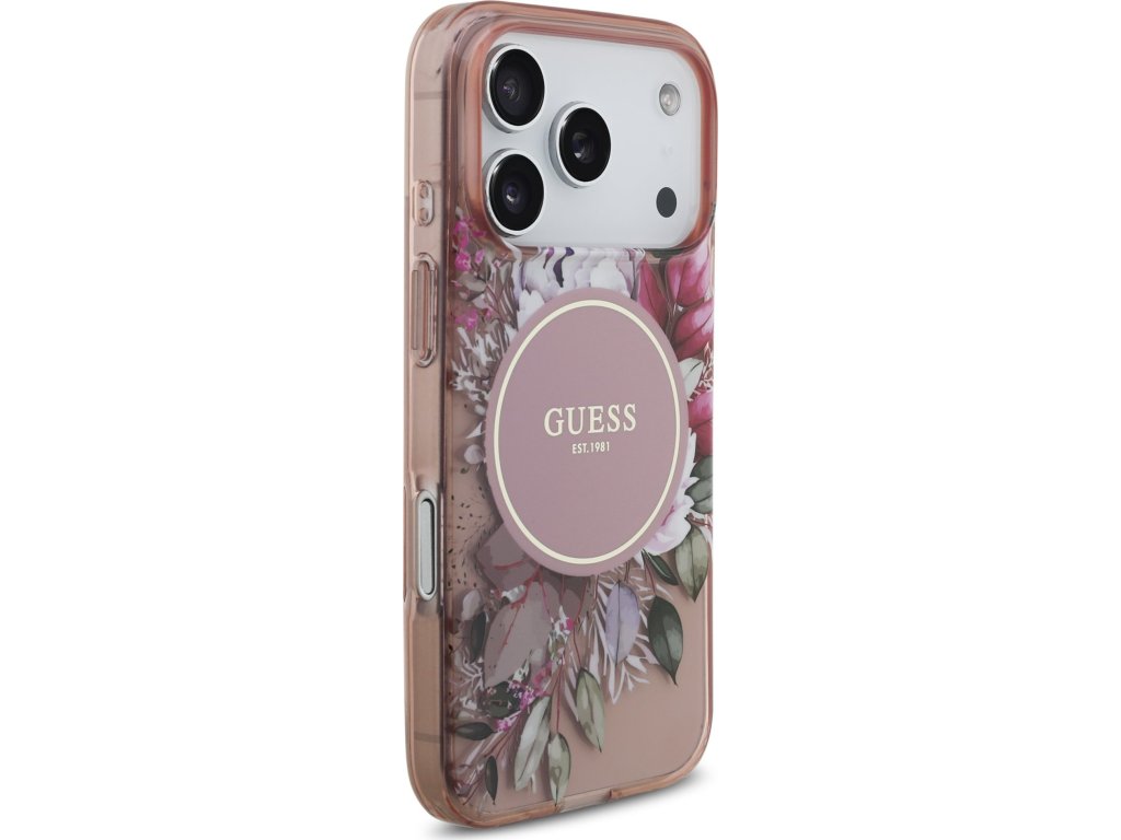 Guess IML Flowers Strap MagSafe Zadní Kryt pro iPhone 17 Pro Pink