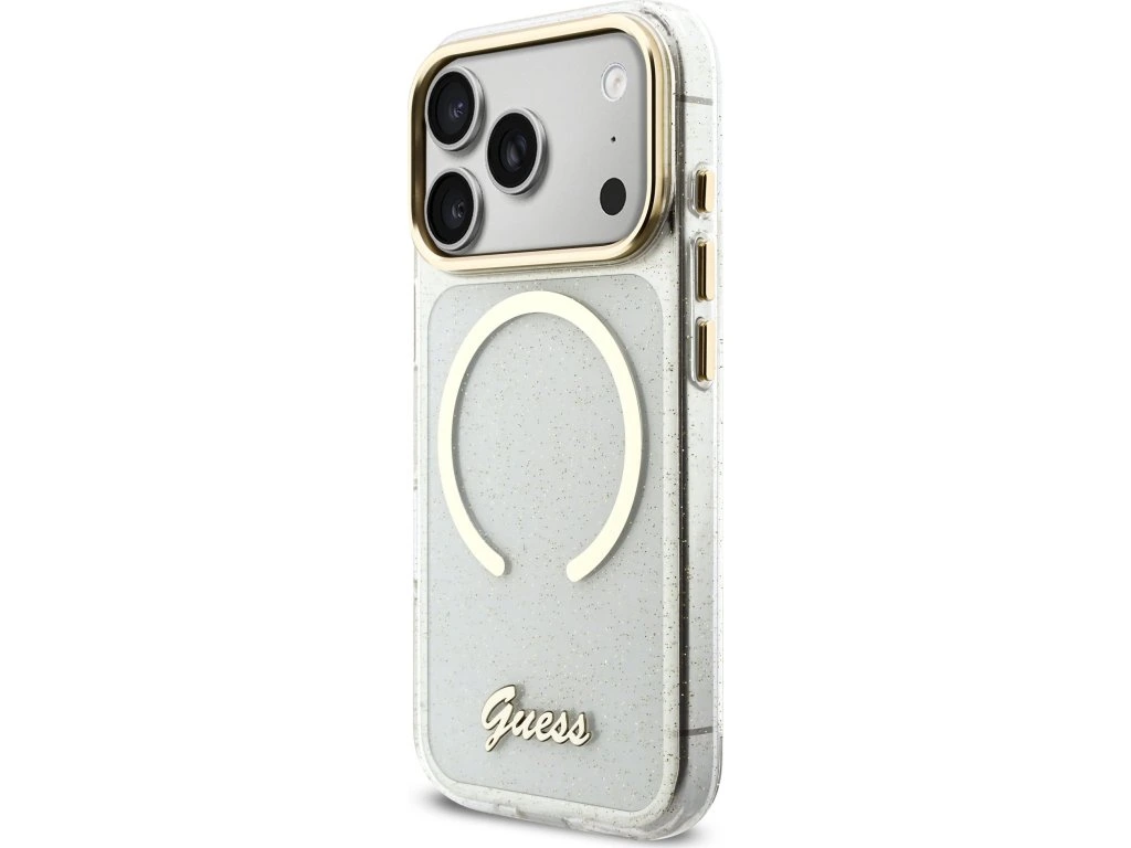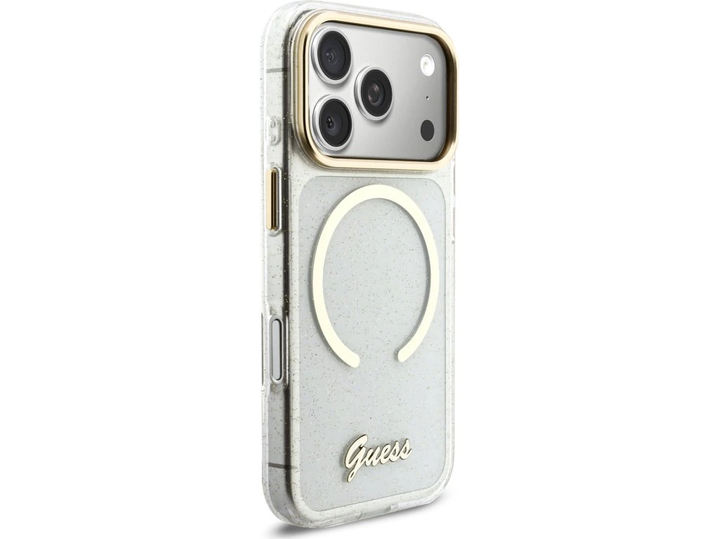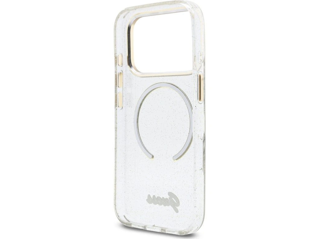 Guess IML Glitter Script Strap MagSafe Zadní Kryt pro iPhone 17 Pro Transparent