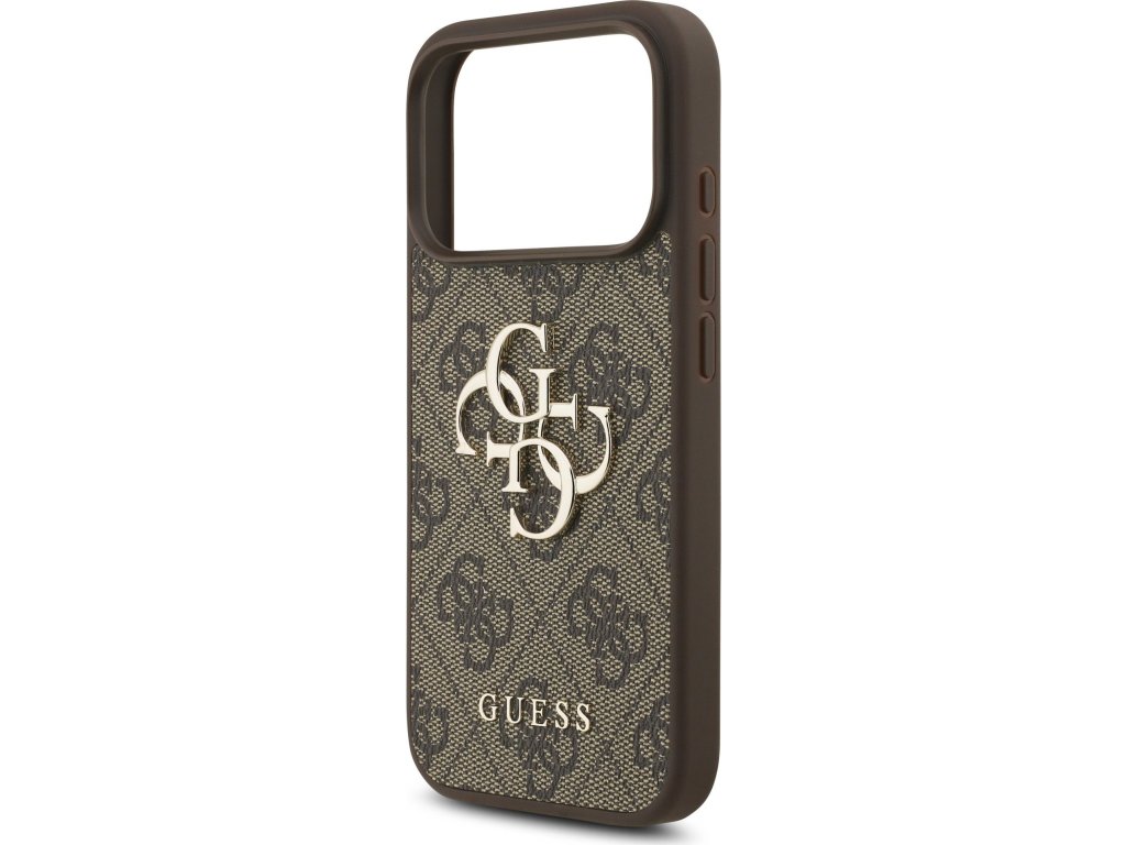 Prémiový zadní kryt Guess PU 4G Metal Logo se vyznačuje elegantním, charakteristickým 4G vzorem, doplněným o logo GUESS.