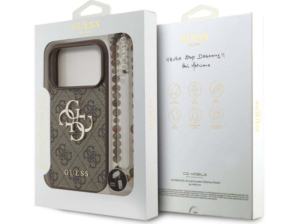 Prémiový zadní kryt Guess PU 4G Metal Logo Strap se vyznačuje elegantním, charakteristickým 4G vzorem, doplněným o logo GUESS. Kryt je vyrobený z lehkého a odolného polyuretanu (PU) s povrchovou úpravou z PU kůže a nabízí tak nejen skvělou ochranu telefonu, ale také pohodlí při používání. Tato povrchová úprava zajišťuje pevný úchop, což minimalizuje riziko, že telefon vyklouzne z ruky. Díky přesnému tvaru perfektně sedí na telefonu a umožňuje snadný přístup ke všem tlačítkům a konektorům. Tento prvotřídní kryt doplněný výrazným 4G logem a je skvělou nabídkou pro lidi, kteří si v módě cení nejen exkluzivního vzhledu, ale také vysoké kvality a funkčnosti. Kryt je doplněn elegantním korálovým poutkem, který můžete nasadit na zápěstí, aby vám telefon nevyklouzl z ruky. To vám zaručí bezpečné manipulování s Vaším zařízením. Je to nezbytný doplněk pro každého, kdo hledá kombinaci elegance a prestiže. Klíčové vlastnosti: - Originál Guess - Dominantní kovové logo 4G - Lehký a odolný kryt z PU a PU kůže - Skvěle se drží v ruce a neklouže - Přesně kopíruje tvar telefonu a umožňuje snadný přístup k tlačítkům a konektorům. - Chrání telefon před prachem a poškrábáním - Luxusní doplněk pro váš telefon i outfit - Doplněno stylovým korálovým poutkem