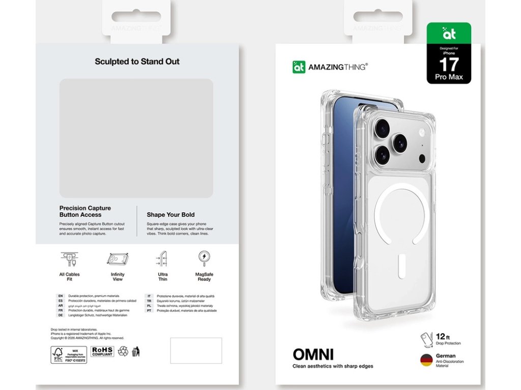 The AmazingThing Omni case offers elegant protection for the iPhone 17 Pro, highlighting the phone's modern character while effectively protecting it. The slim, ultra-thin design adds minimal bulk, and its transparent finish allows you to fully enjoy the smartphone's original design. High-quality German material, resistant to yellowing, ensures long-lasting clarity and an aesthetically pleasing appearance. Square edges and sharp lines give the case a distinctive style, while the reinforced construction protects the device from drops of up to 3.6 meters. The Omni model is fully compatible with MagSafe technology, allowing for convenient use of magnetic chargers and accessories.