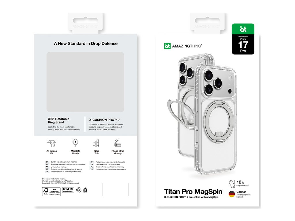 The AmazingThing Titan Pro MagSpin case combines modern style with advanced protection, designed specifically for the iPhone 17 Pro. Its slim design adds minimal bulk, while the 360° rotating bezel acts as a convenient stand and grip. X-CUSHION PRO™ 7 technology effectively absorbs shock, dispersing impact and providing protection from drops of up to 3.6 meters. High-quality German polymer resists yellowing, ensuring the case maintains its aesthetic appeal for years to come. MagSafe compatibility allows you to conveniently use magnetic chargers and accessories. The subdued gray color gives your smartphone a sleek, professional feel.