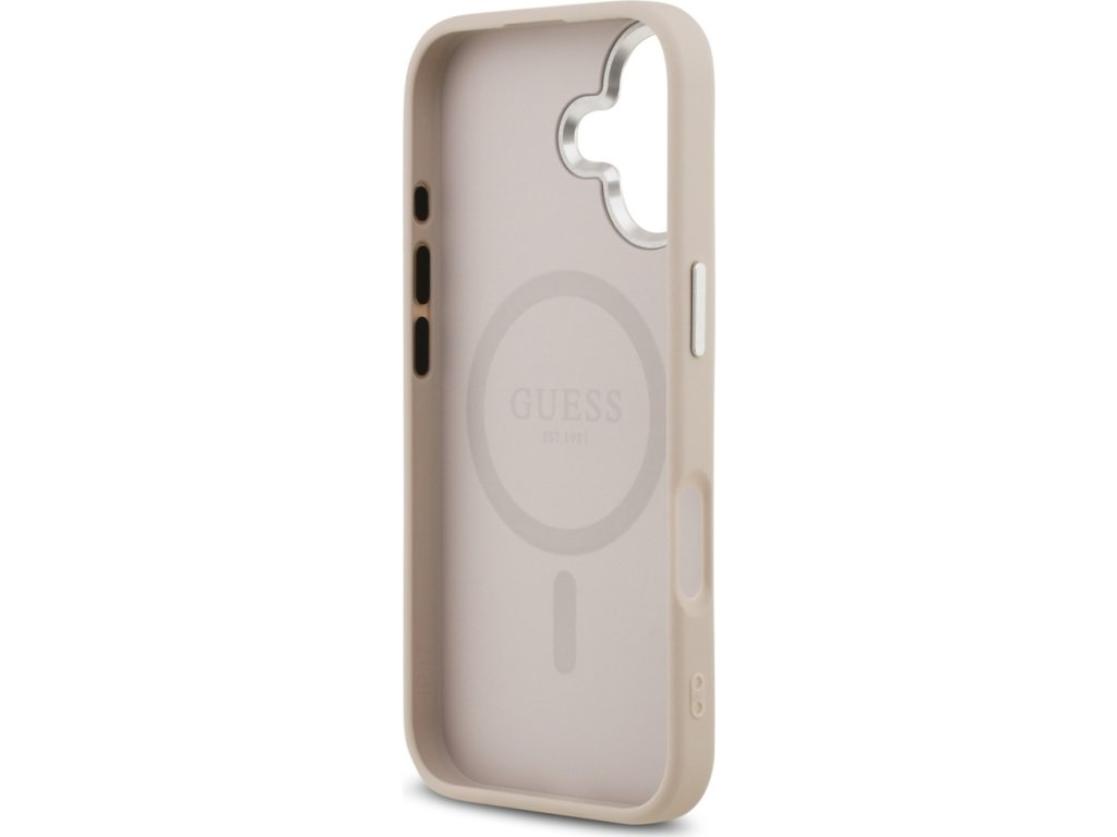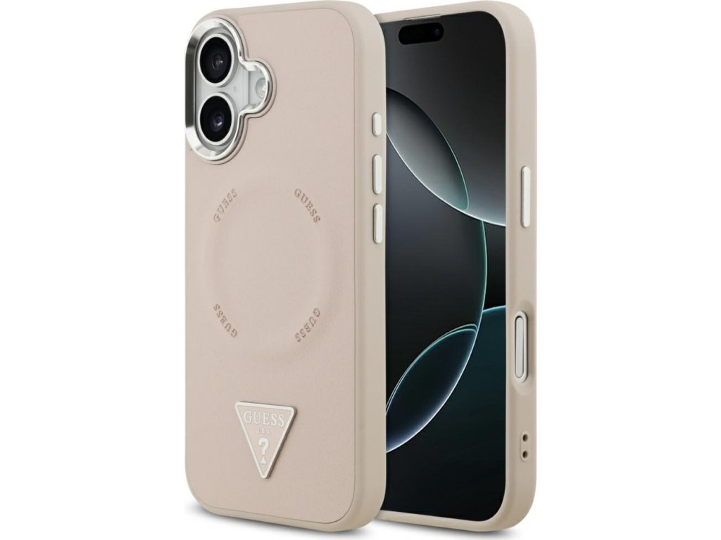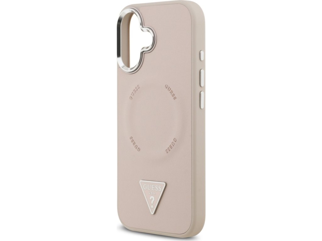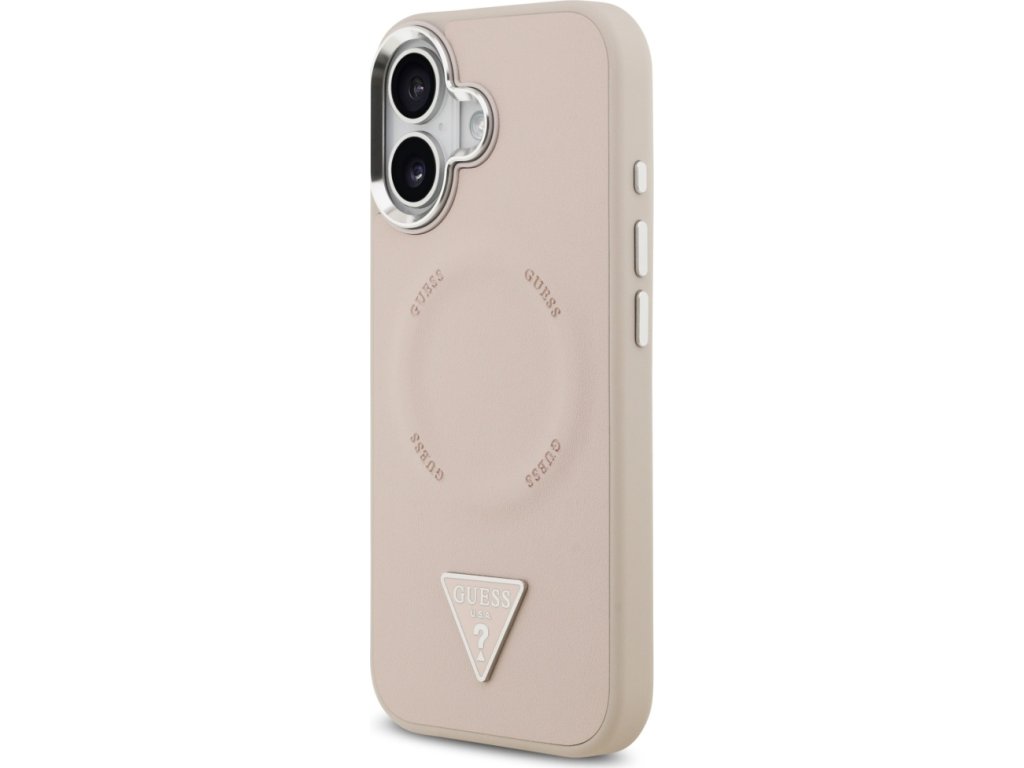 Pouzdro Guess Magsafe z umělé kůže s trojúhelníkovým logem, stříbrné, kovové, s rámečkem pro fotoaparát, pro iPhone 17, růžové