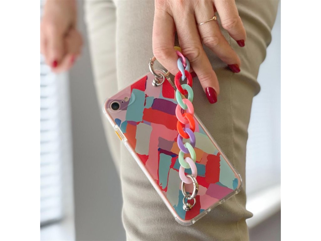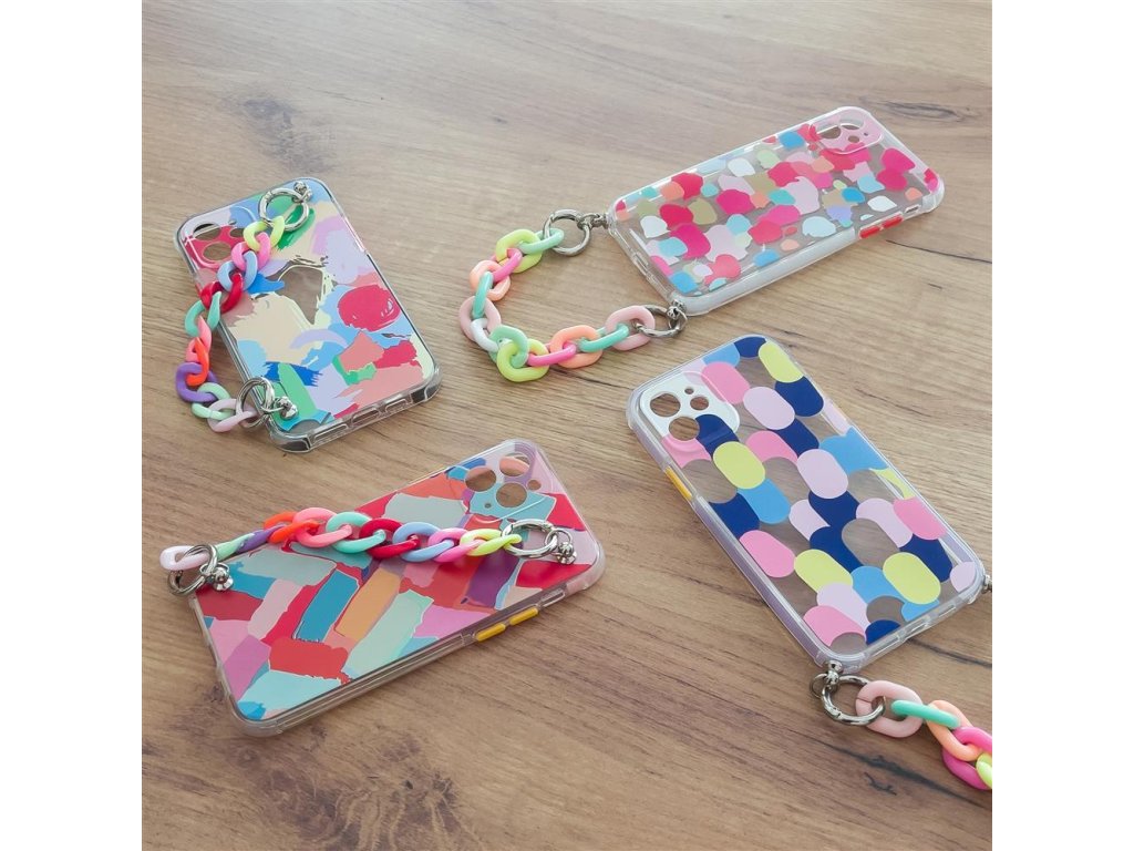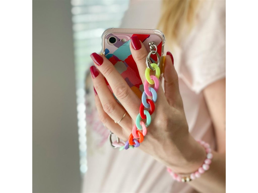 Barevný kryt na iPhone, který se vyznačuje sladěným ozdobným řetízkem. Úlohou tohoto pozoruhodného doplňku není jen originální dekorace, ale také ještě bezpečnější úchop zařízení v ruce. Přítomnost řetízku zabraňuje vypadnutí smartphonu při fotografování, sledování filmů nebo čtení zpráv.