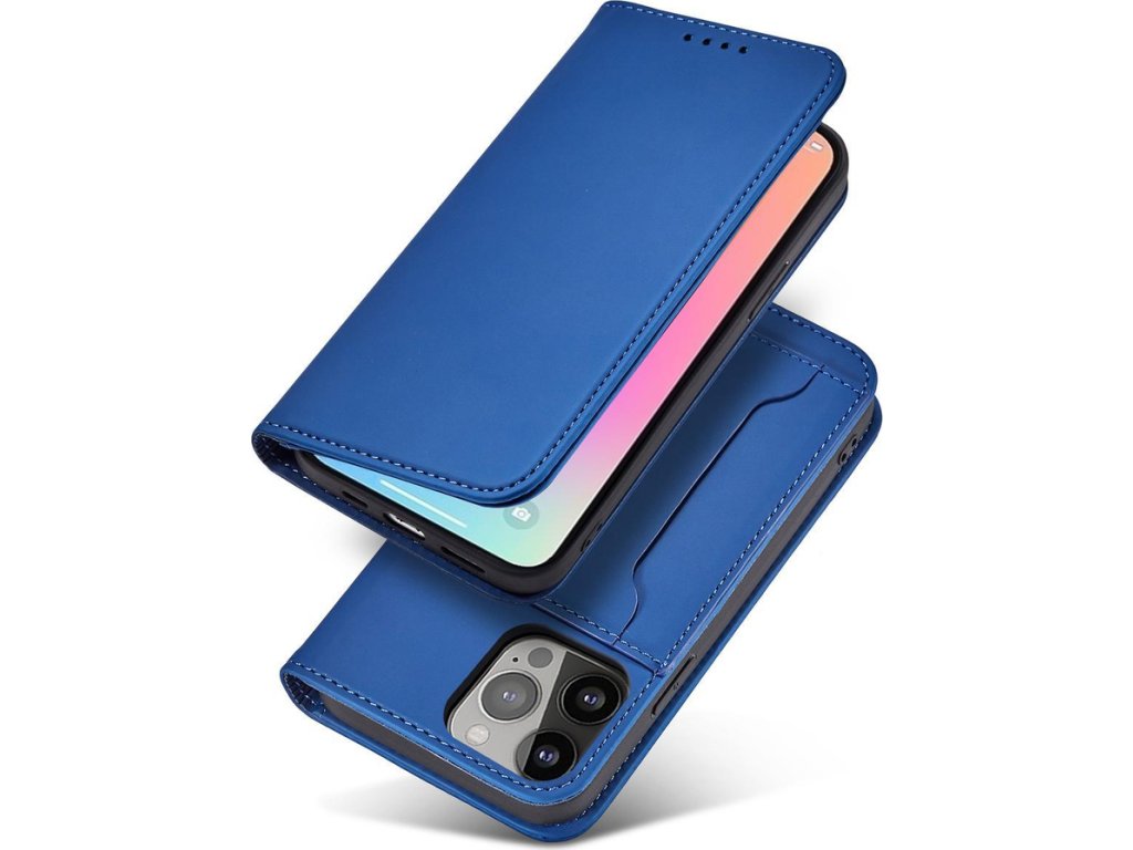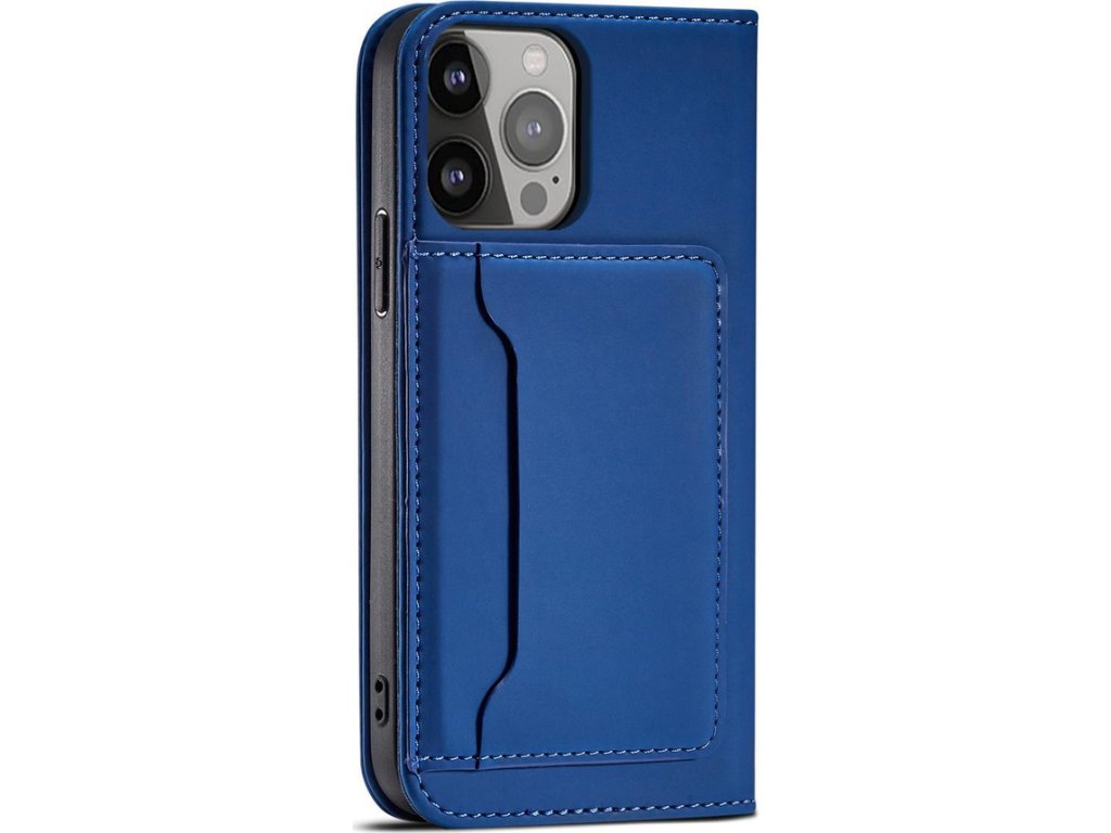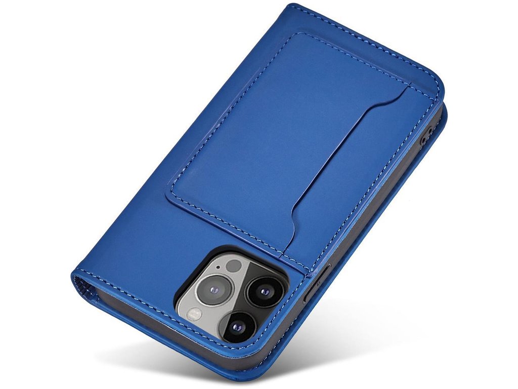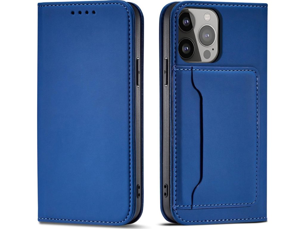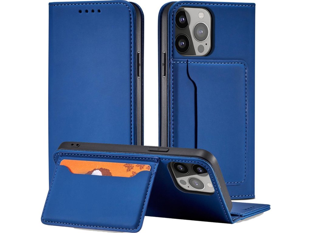 Pouzdro Magnet Card Case pro iPhone řady 14 s odklápěcím krytem, funkcí peněženky a stojánkem v modré barvě