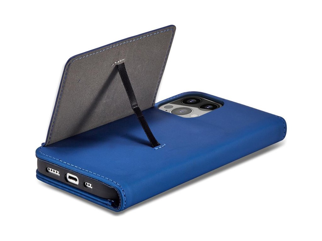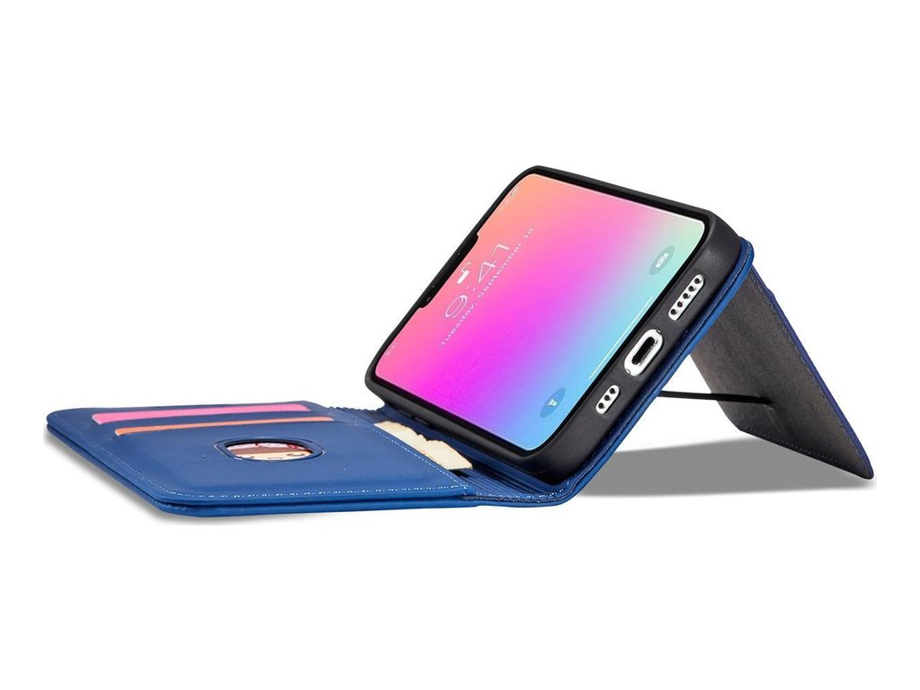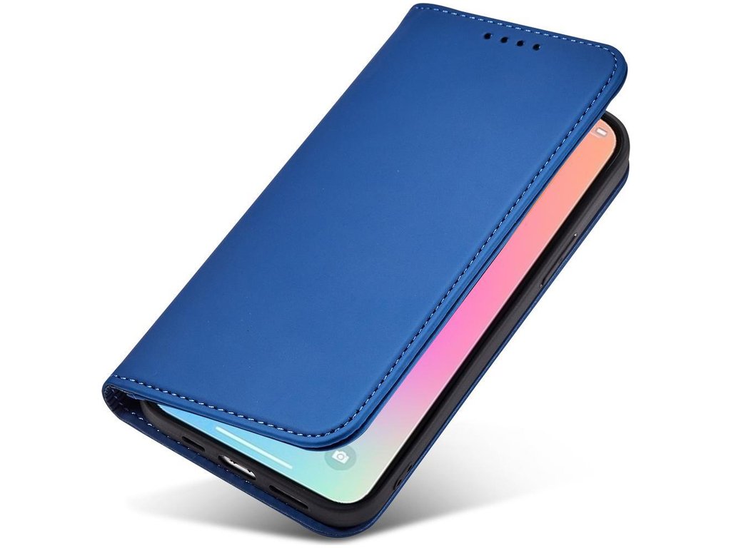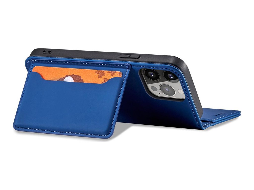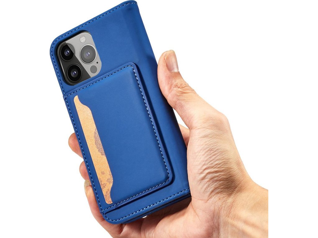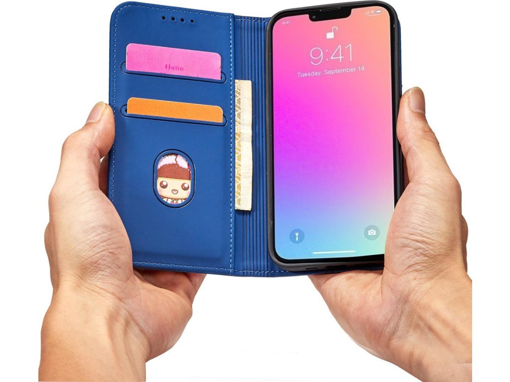 Pouzdro Magnet Card Case pro iPhone řady 14 s odklápěcím krytem, funkcí peněženky a stojánkem v modré barvě