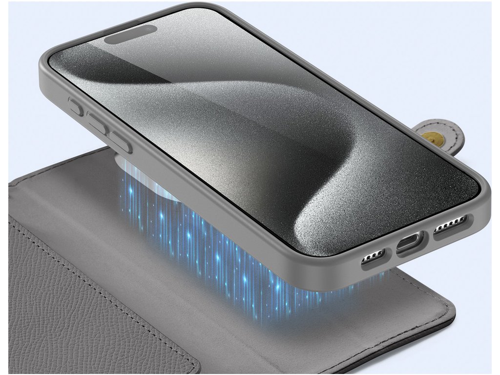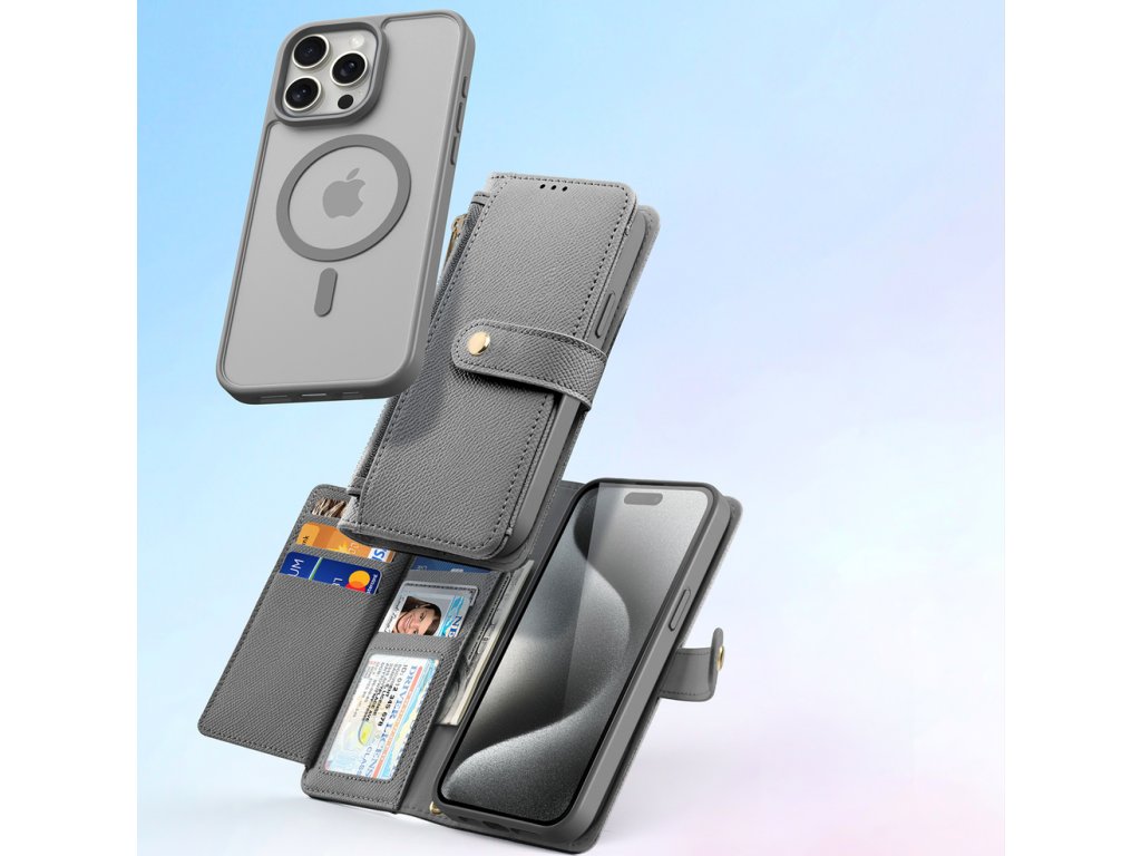 Kožené pouzdro Dux Ducis Lawa pro iPhone 15 Pro s odnímatelným magnetickým pouzdrem – šedé