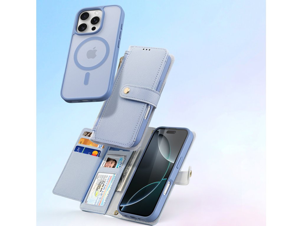 Kožené pouzdro Dux Ducis Lawa pro iPhone 16 Pro Max s odnímatelným magnetickým peněženkou - modré