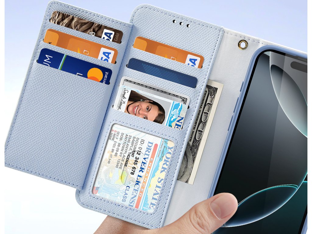 Knížkové pouzdro, zavírání na magnet, vnitřní silikonové pouzdro chránící smartphone před nárazy, 2x slot na platební kartu, úložný prostor na bankovky. Baleno v PE sáčku.